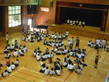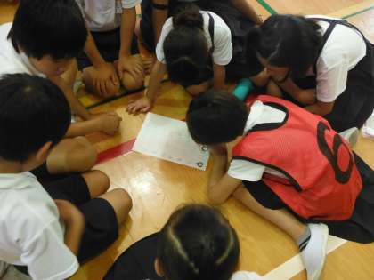 本日の児童集会はスリーヒントクイズでした。たて割り班で話し合って回答を決めました。最後に校長先生から熱中症に関する注意喚起がありました。
