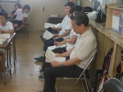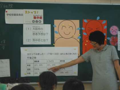 本日の5校時、5年生で校医(内科)の北川先生とPTA給食保健委員長のお二人にもご参加いただき、保健室の笹岡先生と栄養教諭の福田先生が熱中症をテーマに授業形式でグループワークを行いました。授業の主題は以下のとおりです。熱中症に関しては明日の終業式でも笹岡先生から注意喚起を行う予定です。