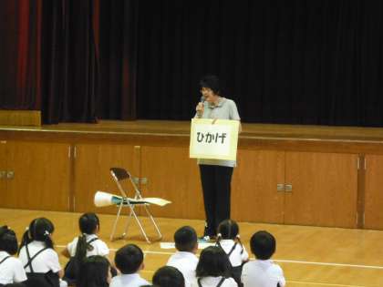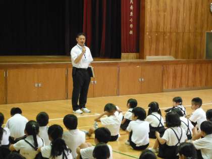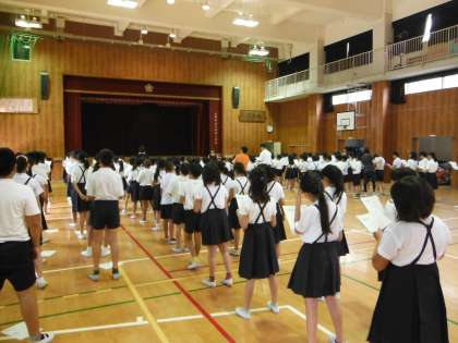 「4月から始まった1学期が、今日で終わります。終業式の今日は、1学期のことを、振り返りましょう。4月以降、授業があった日が何日あったか、わかりますか。実は72日です。遠足や社会見学、5年生は一泊移住等、各学年ごとに色々な行事があって、皆さん一人一人が成長するとともに良い思い出がたくさんできましたね。また、地震や大雨等の災害や猛暑も記憶に残っていることと思います。