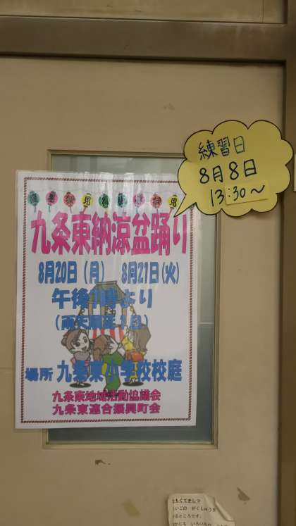 毎年20日(月)、21日(火)恒例の九条東納涼盆踊りの本番に先立ち、今年も8日(水)にいきいき教室にて盆踊りの練習を行います。地域の方々に来ていただき、指導いただきます。子どもたちにはご褒美もいただけるそうです。たくさんのご参加をよろしくお願いします。