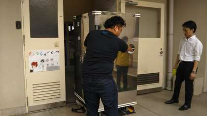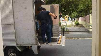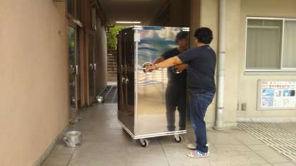 今日(8月24日)は給食を入れるコンテナを積んで、実際に走るルートでトラックが走りました。花乃井中学では配膳の段取りの予行を行いました。