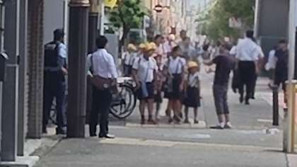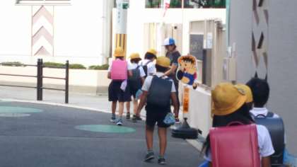今朝は昨日の台風の影響もあり、通学路の安全確保の為、教職員も通学路で見守り活動を行いました。本日も警察官の方に来ていただきました。