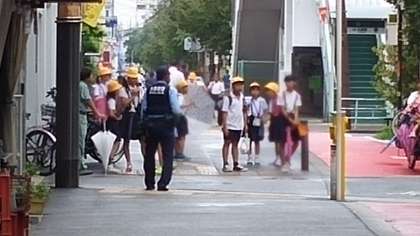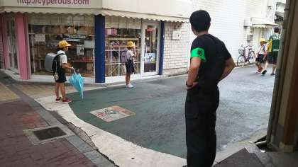 本日も警察の方々に見守り活動を行っていただきました。銀行の横の交差点にも毎日、立っていただいており、自転車の通行者に注意喚起を行ってくれています。おかげさまで商店街の入口で大半の自転車が止まってくれるようになりました。本当にありがとうございます。