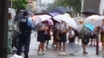 今朝も警察官の方々に、雨の中、見守り活動を行っていただきました。お一人はいつもお世話になっている九条交番のおまわりさんでした。お二人とも何度も立っていただいており、本当にありがとうございます。