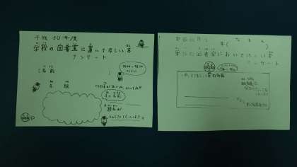 今月の「としょだより」でお知らせしていますが、図書室においてほしい本を大募集しています。アンケート用紙は図書室に置いてあります。今週の金曜日がアンケートの最終日です。全部買える訳ではありませんが、予算の範囲内でみんなのほしい本を揃えたいと思います。ぜひ、子どもたちにどんな本を応募したのか、ご家庭で話題にしてみてください。