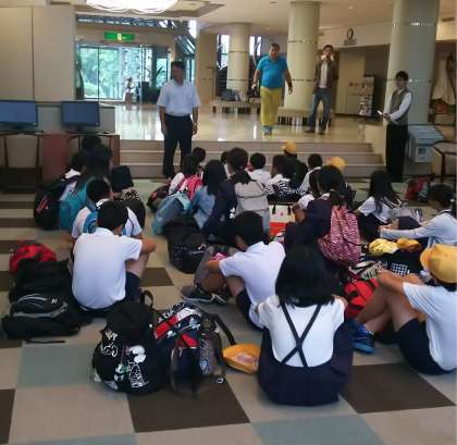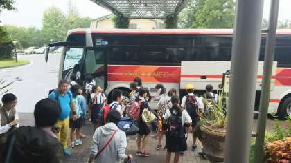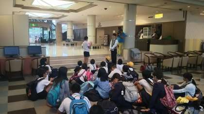 閉舎式がありました。校長先生のお話と、お世話になったホテルに感謝の気持ちを伝えました。次はおやつカンパニーへ工場見学です。