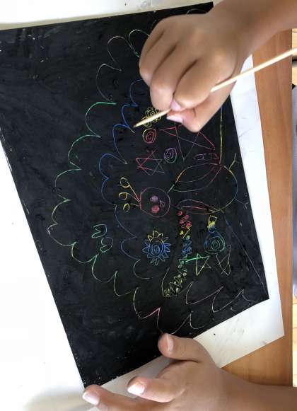 白い画用紙を一面、さまざまないろで塗りこみ、その上から黒一色でさらに塗りこみました。竹串を使って、くじゃくを描いていくと・・・。