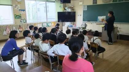 本日の午前中、大阪市中央図書館より図書館司書の方とボランティアの皆さんに来校いただき、全学年の教室にておはなし会を行っていただきました。むかしばなしや、絵本の読み聞かせ、紙芝居に、ブックトーク(本の紹介)、クイズなど工夫を凝らして子どもたちにたくさんのおはなしをしていただきました。終礼のあと、持ってきていただいた本を見せてもらいに集まった子どもたちも多く、みんな、とても喜び、楽しんでいました。