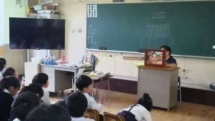 ※写真は上から、本日使用された本(学年別)、紙芝居(2年生)、クイズ(3年生)です。