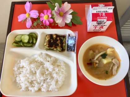 10月1日(月)の給食は、ごはん、お好み焼き、豚汁、きゅうりの梅風味、牛乳でした。