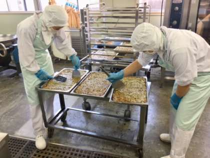 2枚目の写真は、焼きあがったお好み焼きを、調理員さんが切り分けているところです。中学校用の大きさと小学校用の大きさがあります。
