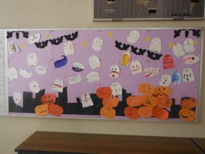 今月の玄関の掲示が変わりました。テーマは「ハロウィン」です。お化けや「ジャック・オー・ランタン」(かぼちゃをくりぬいた提灯)のひとつひとつが、個性があって、とてもかわいらしいです。是非、来校時にご覧ください。