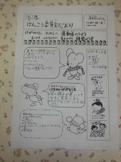 昨日も「せいけつけんさ」が行われました。検査と同時に、けんこう委員が各教室で「けんこう委員会だより 運動会に向けて号」を配布し、色々な注意事項を説明しました。