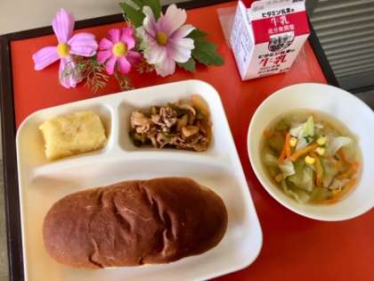 10月9日(火)の給食は、こくとうパン、豚肉と野菜のケチャップソテー、スープ、スイートポテト、牛乳でした。