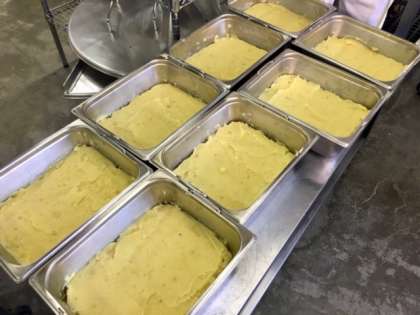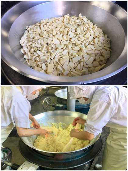 スイートポテトは、旬のさつまいもを煮くずれるまで柔らかく煮て、砂糖とバター、牛乳、クリームを加えてさらに煮た後、クラス分ごとにミニバットに入れて焼き物機で焼いています。