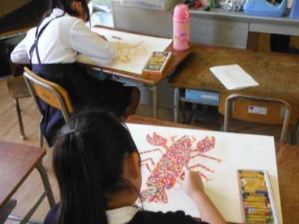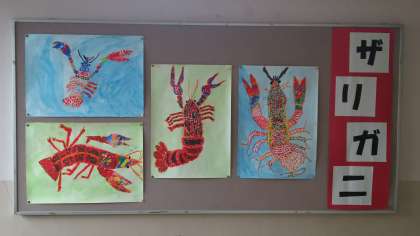 2年生のザリガニの絵です。どの絵がグリーンちゃん、ブルーくん、レッドちゃんなのでしょうか? 掲示されていない絵も含めて、どの絵もとても丁寧に描かれています。