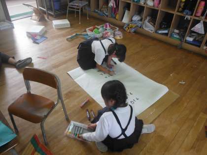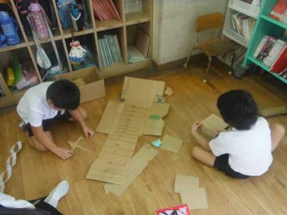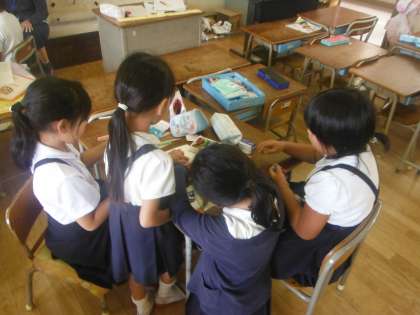10月5日(金)の3校時と4校時の間の休み時間です。本当は休み時間の子どもたちの様子を撮る予定だったのですが、2年生が1年生に遊んでもらうためのおもちゃを一生懸命作っていました。どのおもちゃも工夫がこらしてあり、とても楽しそうなものばかりでした。「おもちゃランド」、大成功で本当に良かったね!!
