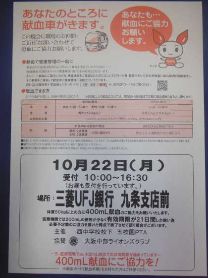 来週の22日(月)に三菱UFJ銀行九条支店前にて五校園PTA主催で献血車に来ていただきます。受付は10時から16時30分でお昼も受付を行います。通常の献血は休日に行かれることが多いと思います。血液にも保管期限があり、平日の献血はとても貴重です。ご協力をよろしくお願い致します。
