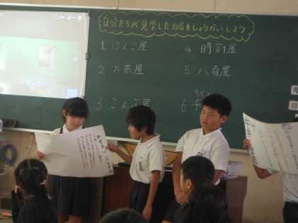 先日、見学させていただいたお店のまとめ発表を行いました。各班ごとに、訪問した時にたくさん教えていただいたことを模造紙にまとめ、タブレットで撮影させていただいた画像データも上手に使えました。商店街のみなさんの暖かいご協力により、今回も素晴らしい体験学習ができました。これからもよろしくお願いします。