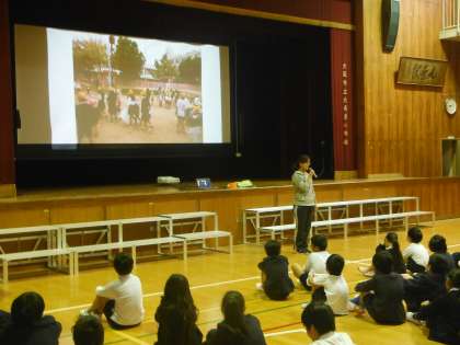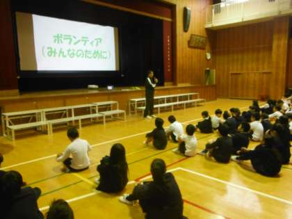 ・最後に、画面に映していますが、ボランティアのお話をします。地域や保護者の方々が、朝や放課後にみんなの登下校の見守り活動を行ってくれています。みなさん、自分の時間をみんなの交通安全の為に使ってくれています。感謝の気持ちを込めて、ご挨拶をしましょう。みんなが先週、頑張ってくれた、「大阪マラソンクリーンアップ作戦!!」や「赤い羽根共同募金」も立派なボランティア活動です。これからもやっていただいている方々に感謝しながら、私たちも頑張りましょう。