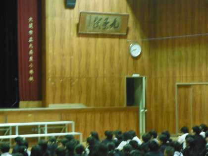 ・さて、次の質問です。講堂の正面右手に炭で書かれた文字の立派な額があります。難しい字ですが「九条校」と書かれています。明治の初めに本校が開校した頃の大阪府知事が書かれたものです。随分と古いものですね。みんなで大切にしましょう。
