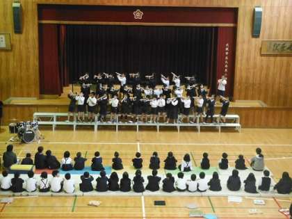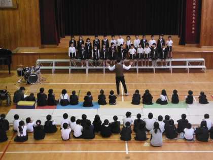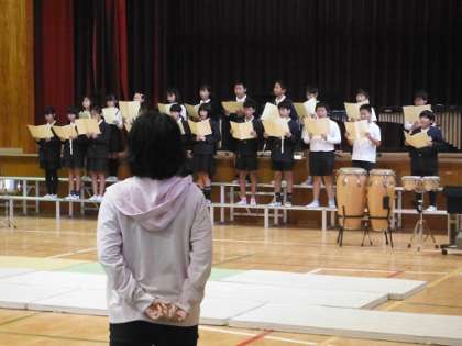 写真は3年生、4年生、6年生です。どの子どもたちもみんな、それぞれの学年らしい合唱、合奏ができています。