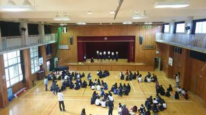 今朝の児童集会は、たてわり班での「ならべかえクイズ(第二弾)」でした。「エレベーター」や「ぎゅうにゅう(牛乳)」、「パソコンしつ(パソコン室)」など、前回よりも難しい問題が多かったのですが、ほとんどの班がみんなで相談し、正解することができました。今月の生活目標に関連して「アルクンジャー」も出題されました。