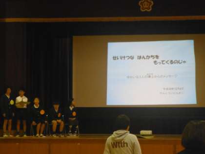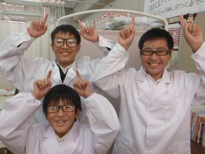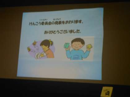 発表の最初と最後の風景・表示と大活躍した3人の博士たちです。「西区 科学実験すごいやん賞」を受賞した「九」博士、「条」博士、「東」博士です。