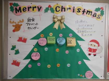 給食委員会がアドベントカレンダーを作成し、給食室前に掲示してくれました。毎日の献立に関わるクイズを「きゅうしょくカレンダー」(その日の献立の解説資料。各教室に掲示されています)を参考に委員のみんなが一日一枚作成してくれました。9日(日)のもちつき大会等で来校される際に是非、ご覧ください。
