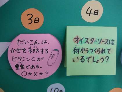 ※アドベントカレンダーはクリスマスまでの期間に日数を数えるために使用されるカレンダーです。3日のメニューではだいこんの煮もの、4日はオイスターソース焼きそばが出ました。