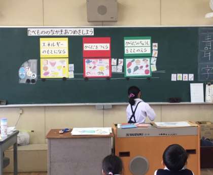 この日の給食に入っていた食べものがそれぞれどのなかまに分けられるのか、みんなで考えて、カードを黒板に貼っていきました。