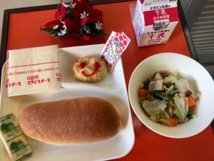 12月17日(月)の給食は、コッペパン、ソフトマーガリン、とうふハンバーグ、スープ煮、スライスチーズ、牛乳でした。