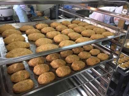とうふハンバーグは、給食室で1つずつ形を作って、焼き物機で蒸し焼きにした手作りのハンバーグです。