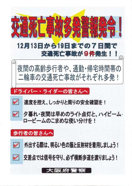 大阪府警より、交通死亡事故多発警報が発令されています。昨日の終業式で児童には注意喚起しておりますが、ご家庭でも繰り返し、指導願います。