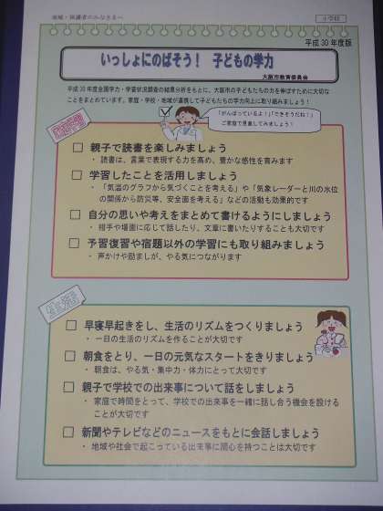先日、表題の大阪市教育委員会のリーフレットを配布しました。当ホームページの右側「配布文書」の「平成30年度学校評価」の欄にも添付しています。学力向上には、家庭・地域・学校が連携して取り組むことが重要であり、大切なことをまとめた資料になっています。ぜひ、目を通していただき、力を合わせて実践していきたいと思います。