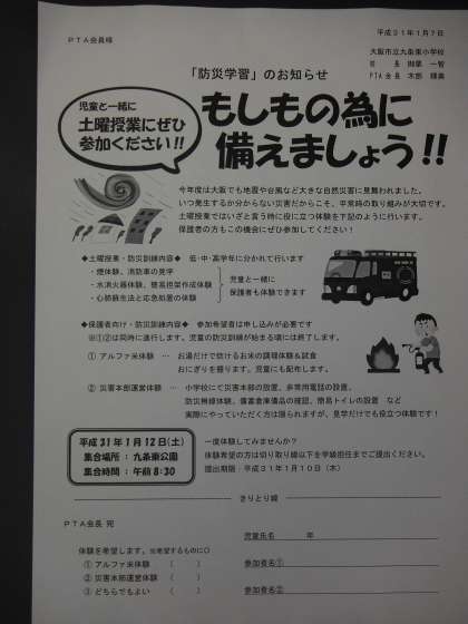 保護者向け・防災訓練に参加される方は、九条東公園に午前8時半集合です。よろしくお願いします。2校時(9時45分開始)から11時までは防災体験学習を行います。児童と一緒に保護者のみなさんも体験できますので、ぜひ、ご参加ください。運動場にて水消火器や消防車両見学、煙体験、搬送要領を体験できます。また、講堂にて心肺蘇生法・応急処置を体験できます。
