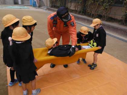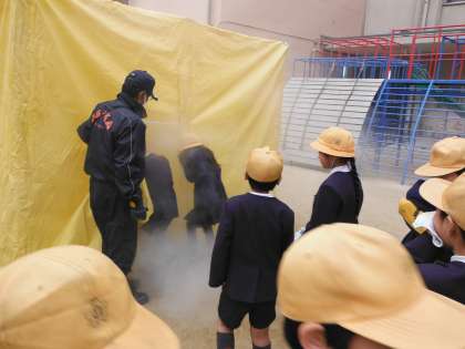 2時間目からは防災体験学習を行いました。1年生から4年生は運動場で、5・6年生は講堂で活動を行いました。運動場では煙体験、搬送要領、消防車見学、水消火器体験をしました。
