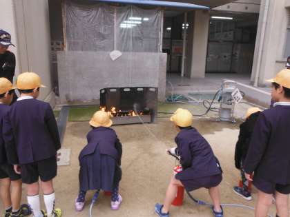下の写真は水消火器を使って実際に消火する体験です。