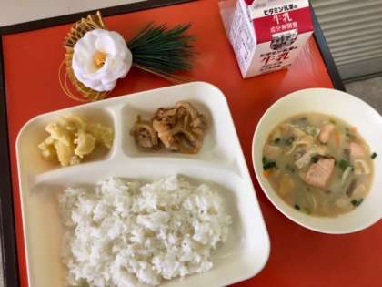 1月15日(火)の給食は、ごはん、鶏肉の甘辛焼き、かす汁、くりきんとん、牛乳でした。