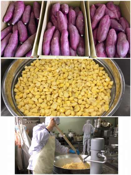 さつまいもをやわらかく煮てつぶし、くりを加えて砂糖などで味付けして煮含めています。