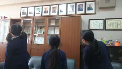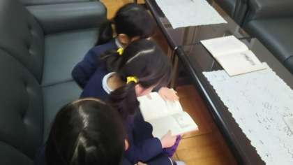 昨日の全体朝会で、防災の話の最後に昭和9年の室戸台風の時の記念碑の話をしました。詳しい記事が本校の創立百周年記念誌に載っており、「校長室にあるのでいつでも見にきてください」と話したところ、昨日と本日、2年生が校長室を訪ねて来てくれました。百周年記念誌を見た後、歴代校長先生の写真をながめ「ほとんどの先生が眼鏡かけてる」と感想を言ってくれました。最後になかよく絵本を読んで、きちんと挨拶をして退室してくれました。