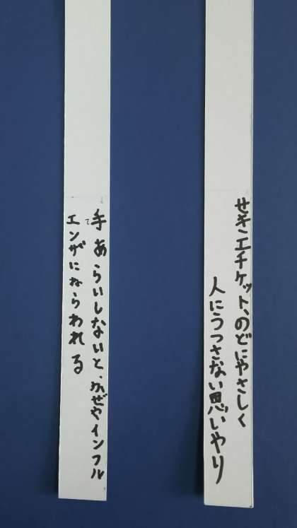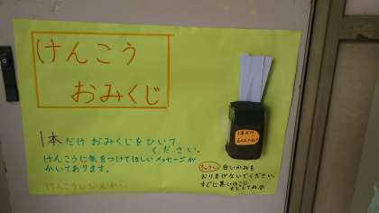 健康委員会が「けんこうおみくじ」を作ってくれました。保健室の開かない方の扉に設置されています。おみくじらしく、一枚一枚に「大吉」や「凶」の表示がしてあり、裏には気をつけてほしいメッセージが書かれています。