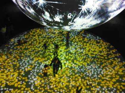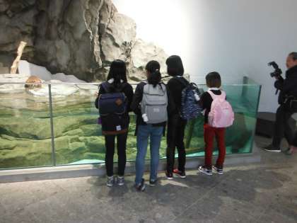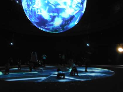 上の写真のコーナーでは「ビーバー」(写真)や「ペンギン」、「コツメカワウソ」、「カピバラ」等が水辺のある水槽の中に居ます。写真はありませんが、「オウギバト」が通路を歩いていました。真ん中と下の写真が吹き抜けゾーンの「ワンダーモーメンツ」です。自然をテーマにしたデジタルアートです。床の丸いゾーンに居る人たちに合わせて映像も変化しているそうです。下の写真、中央に映っている、小さい子どもと手をつないで楽しく歩いているのも本校の児童です。幻想的でとても楽しい空間でした。