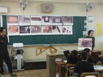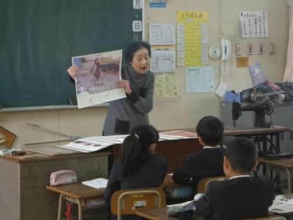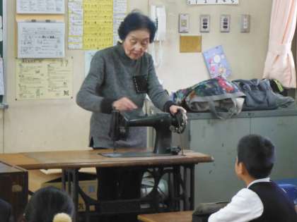 2月4日(月)、地域の方に来ていただいて、昔の道具の紹介をしていただき、お話の後、みんなで七輪を使っておもちを焼きました。真空管ラジオや手押しポンプ、計量マスなどは写真で使い方を説明していただきました。レコード盤とミシンは実物でお話いただきました。昔の生活・暮らしや地域のお話など、色々なお話をしていただきました。