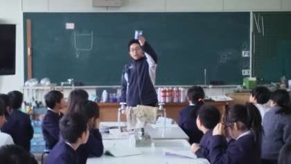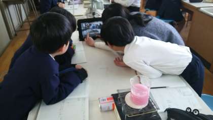 先週、「水のあたたまり方」の授業を行いました。ビーカーに水と示温インクを混ぜたものを入れ、色の変化(青→紫)が分かりやすい様にビーカーの端の部分を温めています。あたためられた水が上に行き、上にあった水と入れ替わることが目で確認できました。タブレットも使いながらのとても分かりやすい授業でした。