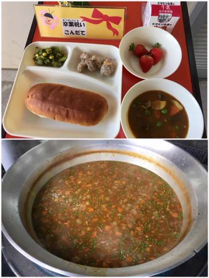 3月8日(金)の給食は「卒業祝い献立」で、おさつパン、フライドチキン、カレーシチュー、春のカラフルソテー、いちご、牛乳でした。