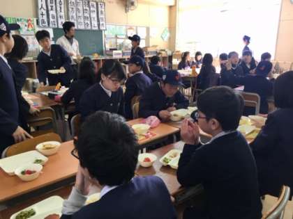 5枚目は6年生の給食時間の様子です。フライドチキンのおかわりじゃんけんをしていました。