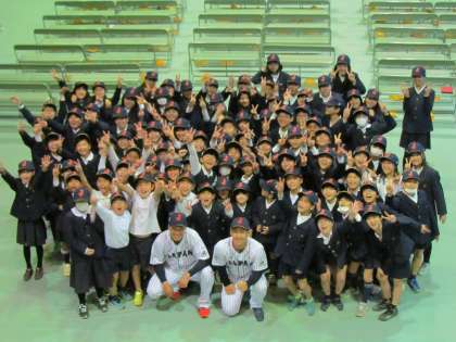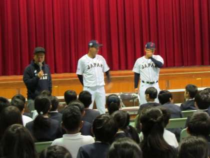 侍ジャパンの吉田選手・大山選手が本校を訪れ、児童への話と実技を披露していただきました。