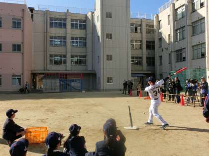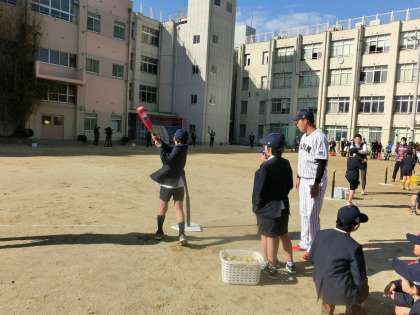 ティーバッティングの様子です。野球をほとんどやったことが無い子どもたちも一生懸命に取り組み、両選手からアドバイスをもらったり、声をかけてもらいました。最後は吉田選手のフルスィングで締めくくりました。