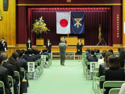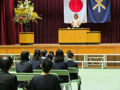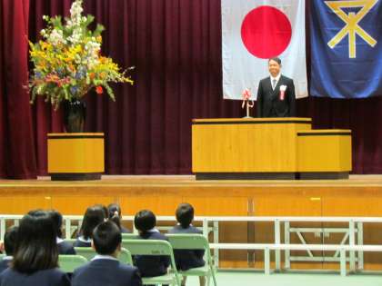 入学式は新1年生の17名が全員参加し、予定どおり10時に開式となりました。写真は上から学校長式辞、PTA会長祝辞、1年生にかかわる先生方の紹介です。